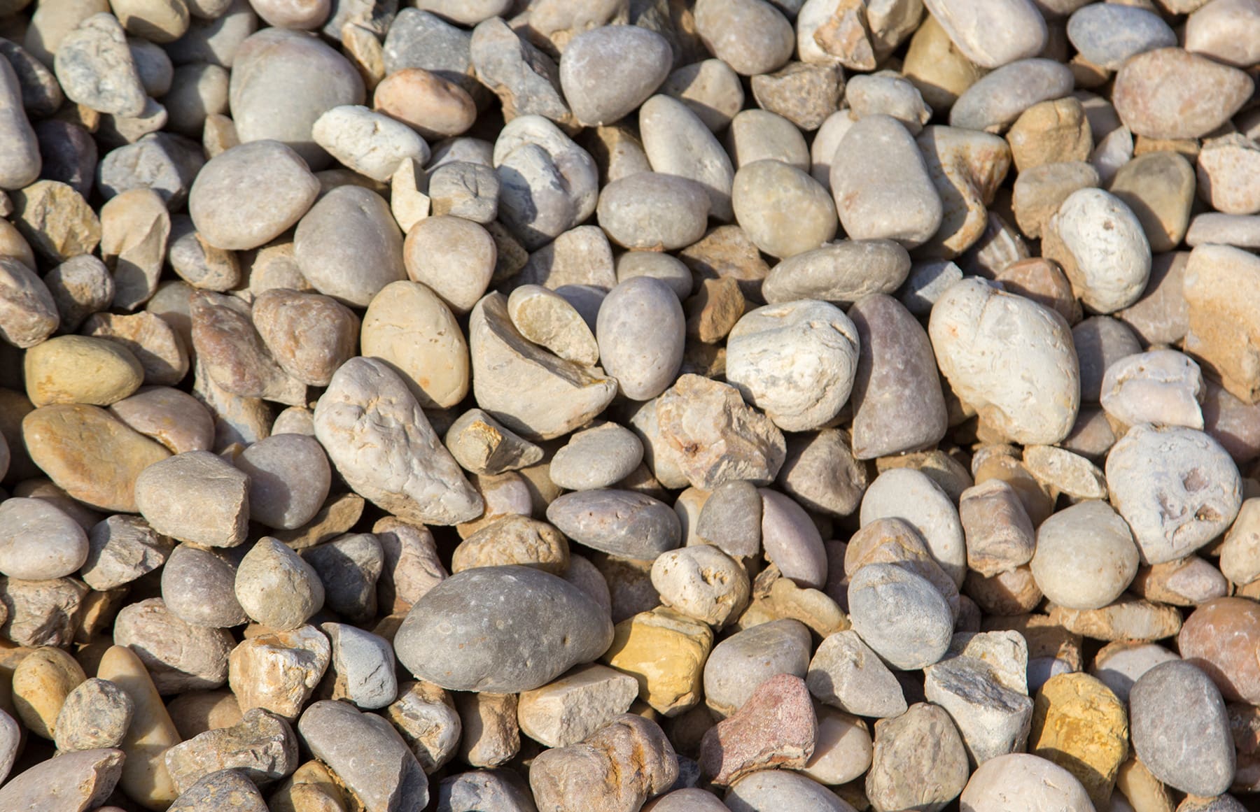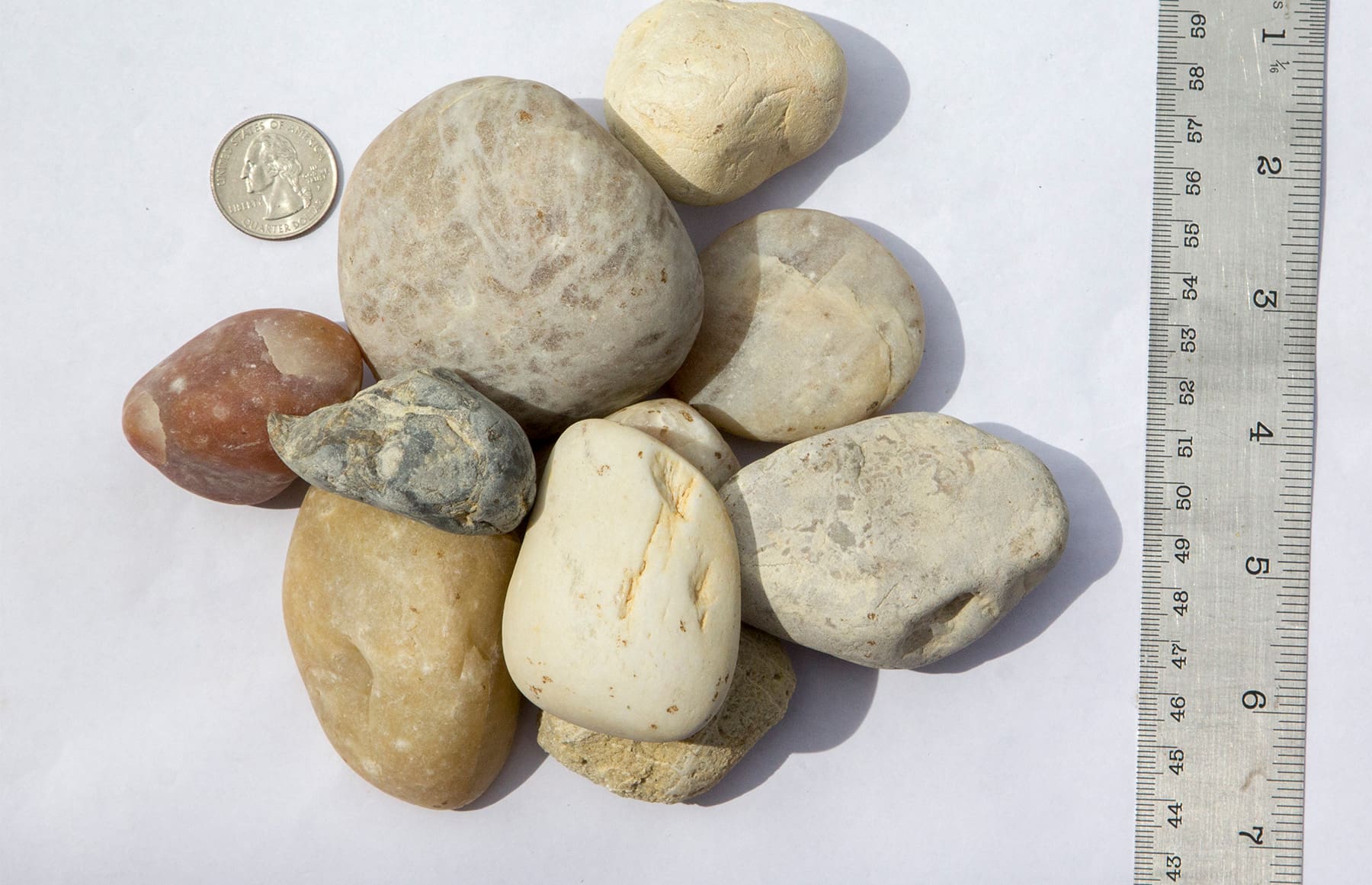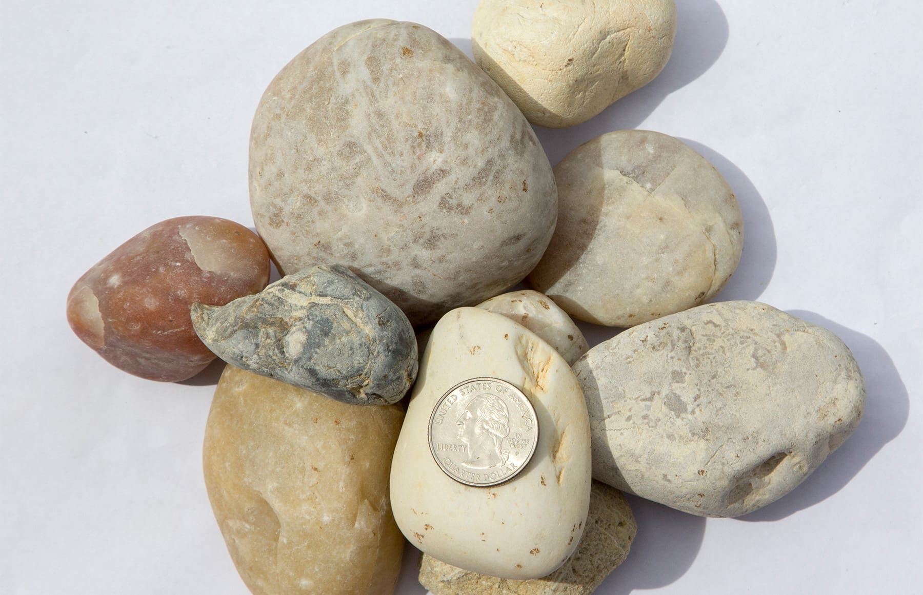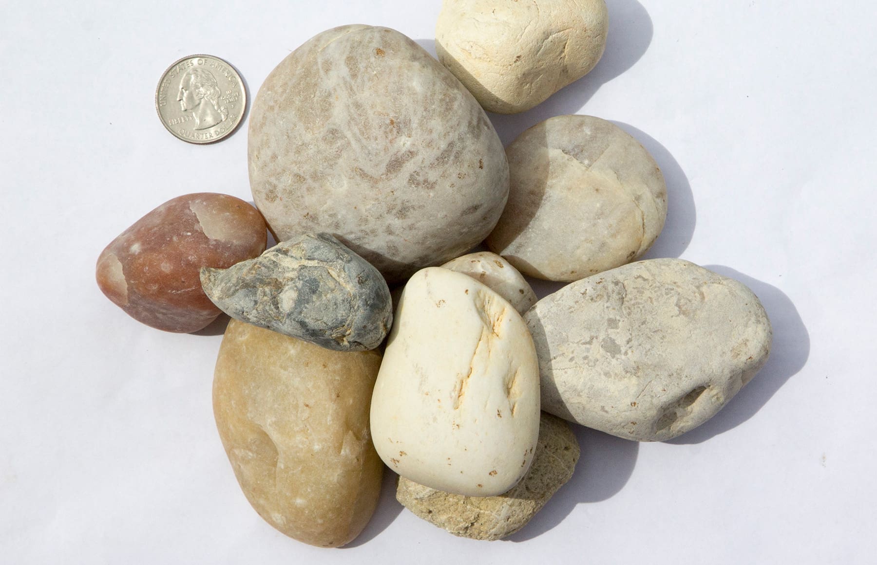 A smooth light brown, orange, grey, tan, and translucent white decorative river rock ranging in 2-3” sizes.